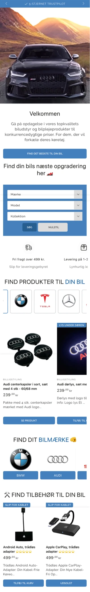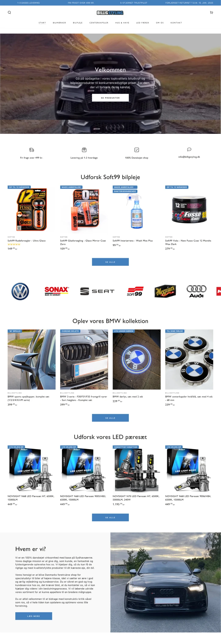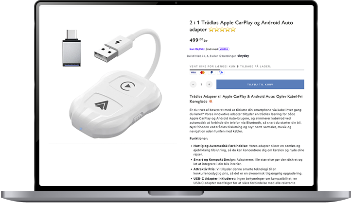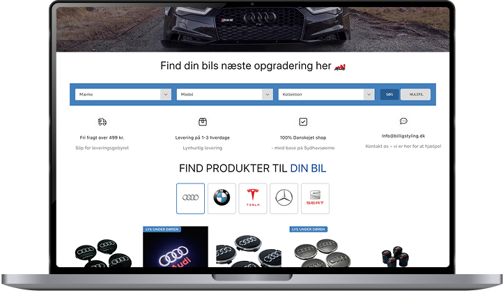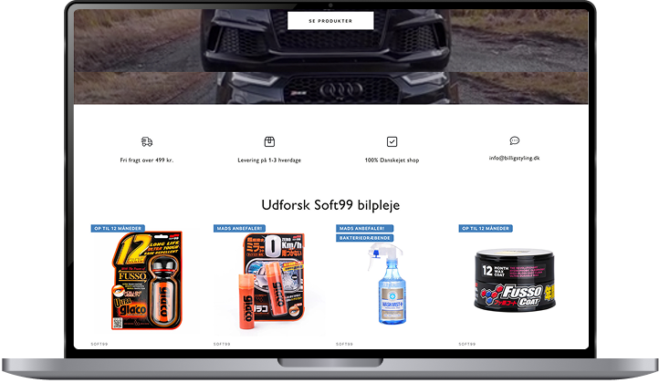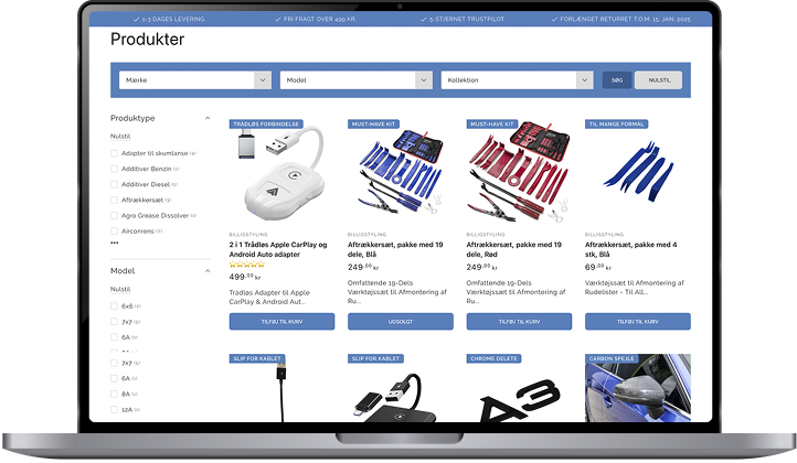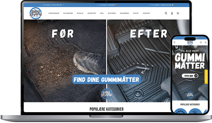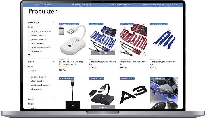 En shop med produktet i centrum frem for tekst og støj. Let og nem navigation på både computer og mobil, så kunden finder vej uden friktion. Et tydeligt søgefelt, der hjælper kunden på vej. Og flere bundle-løsninger, der afdækker flere behov og hæver AOV med hver ordre.