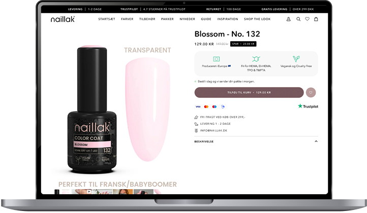 En struktureret menu på både mobil og computer, der gør navigation intuitiv. Hele shoppen er bygget op med sider og content, der skaber en bestemt følelse, når kunden bevæger sig fra forside til kollektionsside til produktside. Resultatet er en kunderejse, der handler om oplevelse og æstetik – ikke bare produkter.